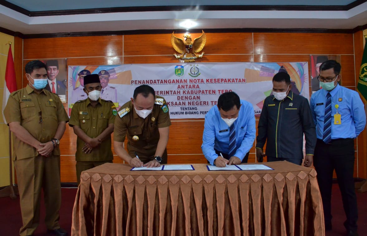 JAMBIPRIMA.COM, TEBO - Bupati Tebo, Dr. H. Sukandar, S. Kom. M. Si. bersama Kepala Kejaksaan Negeri (Kajari) Tebo Imran Yusuf SH, MH. menandatangani MOU tentang Penanganan Permasalahan Hukum Bidang Perdata dan Tata Usaha Negara, pada Selasa (16/02/2021).