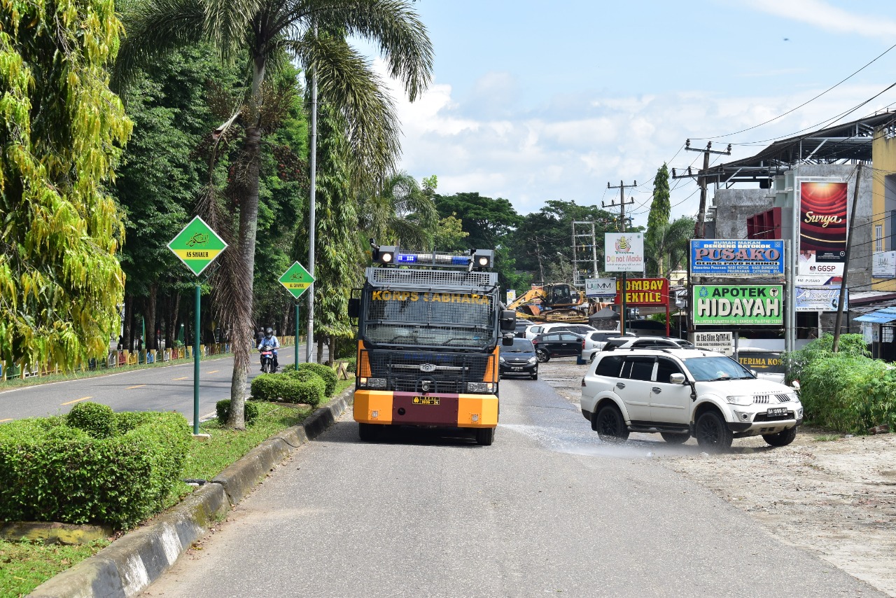 Penyemprotan itu mencegah antisipasi penyebaran virus covid 19 pasca lebaran, menggunakan mobil AWC milik Polres Merangin.