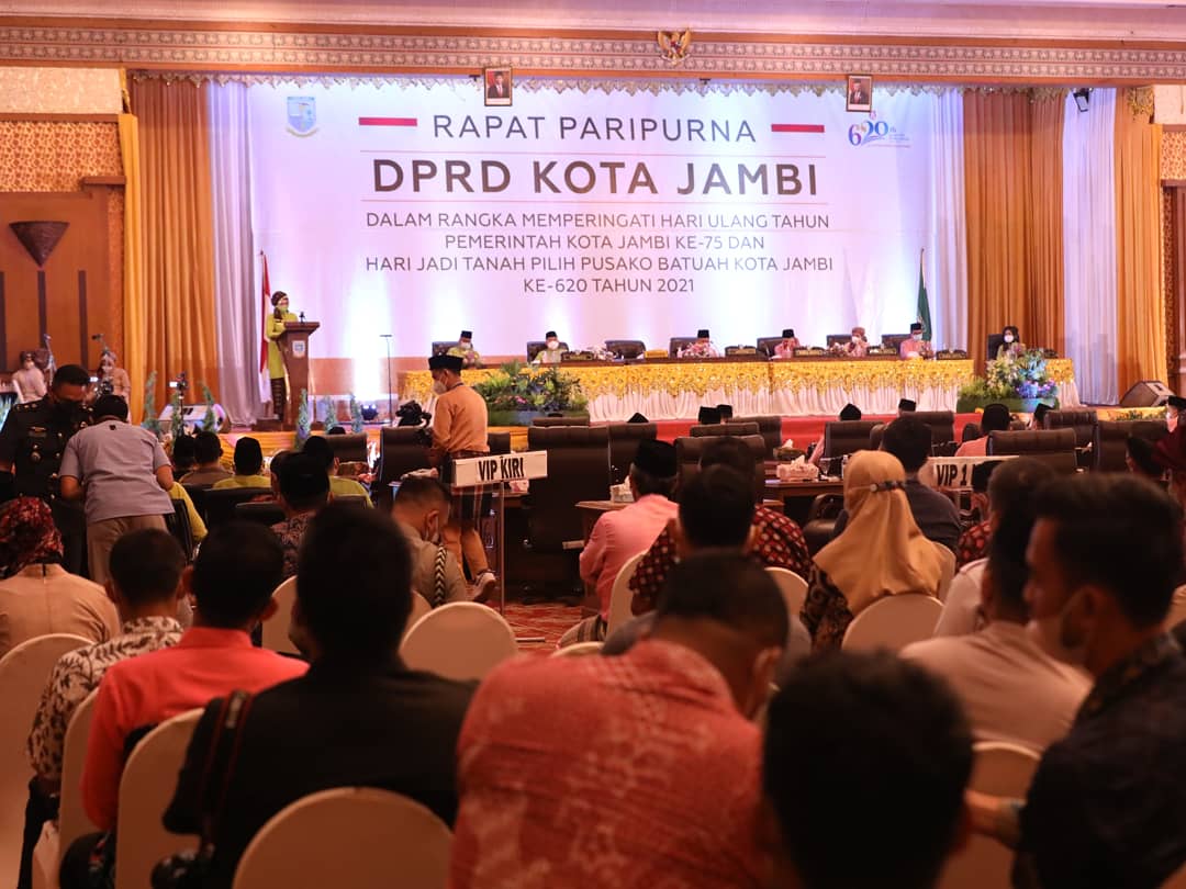 JAMBIPRIMA.COM, MUARA TEBO - DPRD Kota Jambi menggelar rapat Paripurna dalam rangka memperingati Hari Ulang Tahun (HUT) Pemerintah Kota Jambi ke- 75 dan Hari jadi Tanah Pilih Pusako Batuah Kota Jambi ke- 620 Tahun 2021 bertempat di Ball Room Hotel Abadi Convention Center, Jumat (28/5).