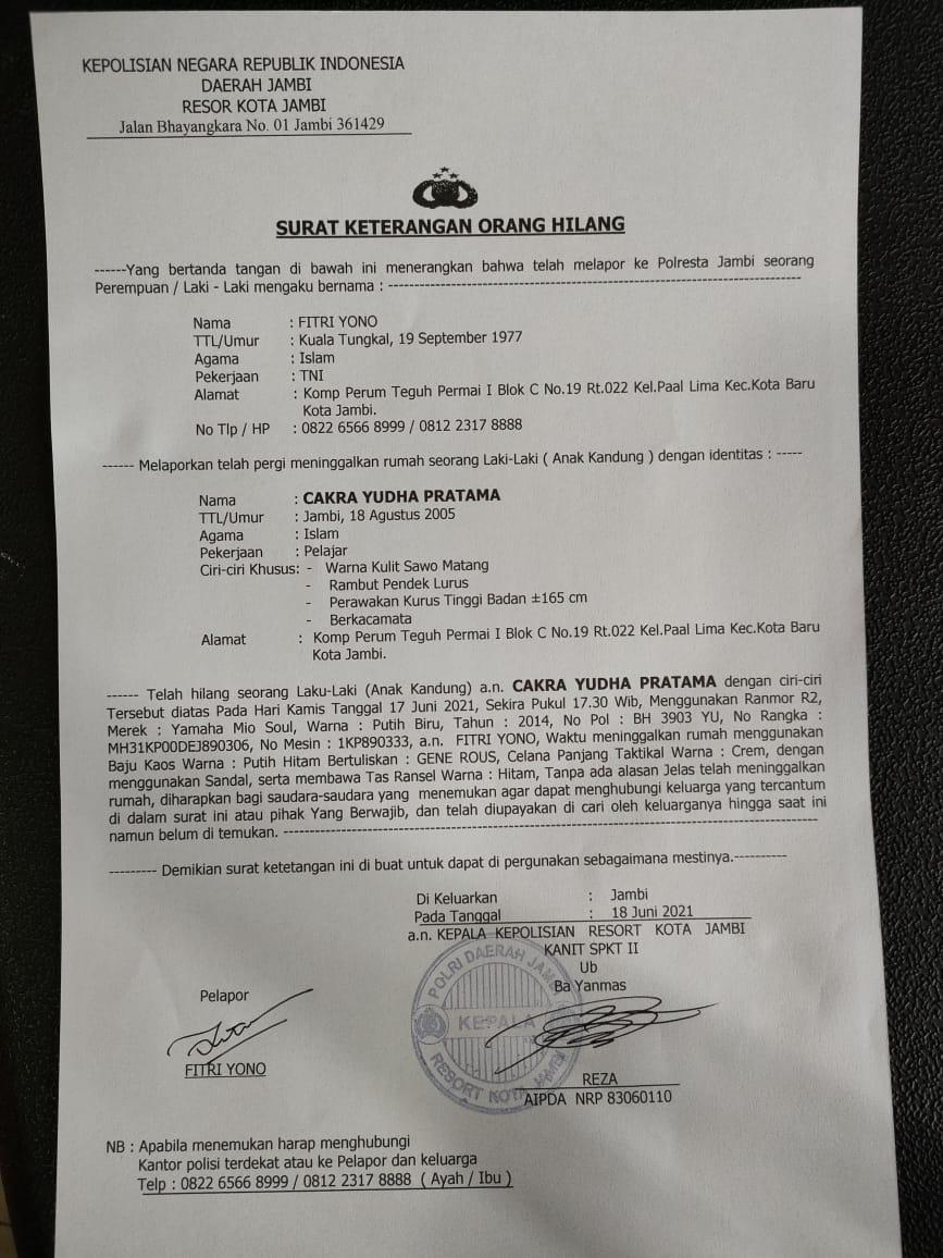 Endri Yati mengatakan, kasus hilangnya anak kandungnya ini sudah dilaporkan ke petugas SPKT Polresta Jambi pada Jumat (18/6) yang diterima oleh Kanit SPKT II melalui Bagian Yanmas Aipda Reza.
