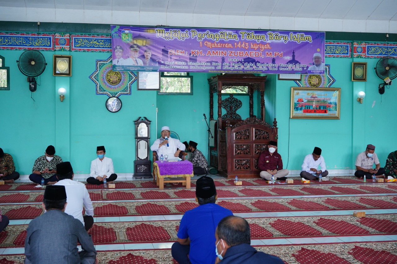 JAMBIPRIMA.COM, TEBO - Pemerintah Kabupaten (Pemkab) Tebo menggelar peringatan Tahun Baru Islam 1 Muharam 1443 H di Mesjid YAMP KH. Zaharudin Usman Komplek Perkantoran Pal. 12 Muara Tebo, Kamis (12/8).
