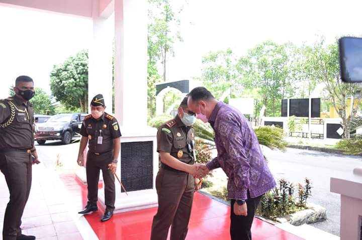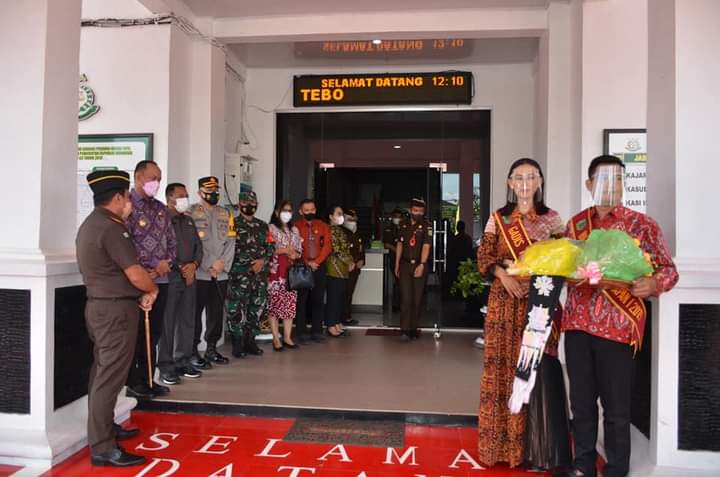 JAMBIPRIMA.COM, TEBO - Bupati Tebo Dr. H. Sukandar, S.Kom, M.Si bersama Forkompinda secara lansung menyambut kunjungan Kerja Kepala Kejaksaan Tinggi (Kejati) Jambi Sapta Subrata, SH di Kantor Kejaksaan Negeri (Kejari) Muara Tebo, Kamis (14/10).