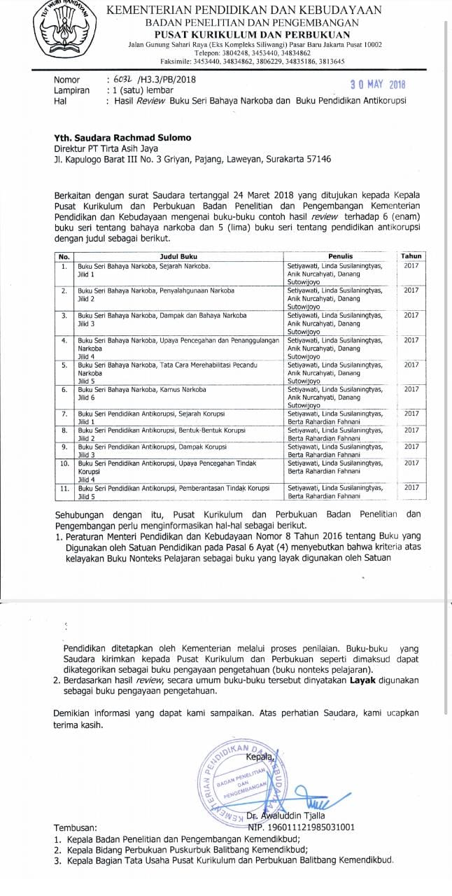 Namun, setelah di telusuri Buku buku yang di hadirkan oleh Penerbit PT Tirta Asih Jaya dari Jawa Tengah itu merupakan program penguatan pendidikan karakter yang berupa Rencana Aksi Inplementasi pendidikan Karakter dan Budaya anti korupsi bagi satuan pendidikan Dasar, serta memiliki SK Pusat Kurikulum Perbukuan (Puskurbuk) dari Kenendikbud-RI serta telah mengantongi Izin resmi.