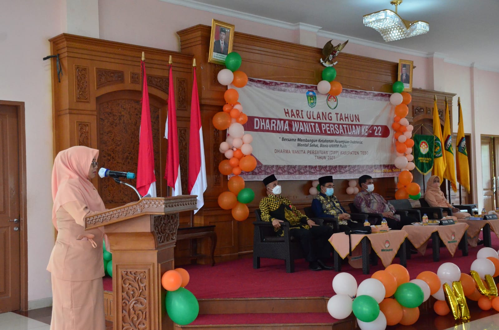 JAMBIPRIMA.COM, TEBO - Puncak peringatan HUT Dharma Wanita Persatuan ke- 22 Tahun 2021 di Kabupaten Tebo dihadiri Sekretaris Daerah Tebo Drs. Teguh Arhadi, MM di Pendopo, pada Kamis (9/12).