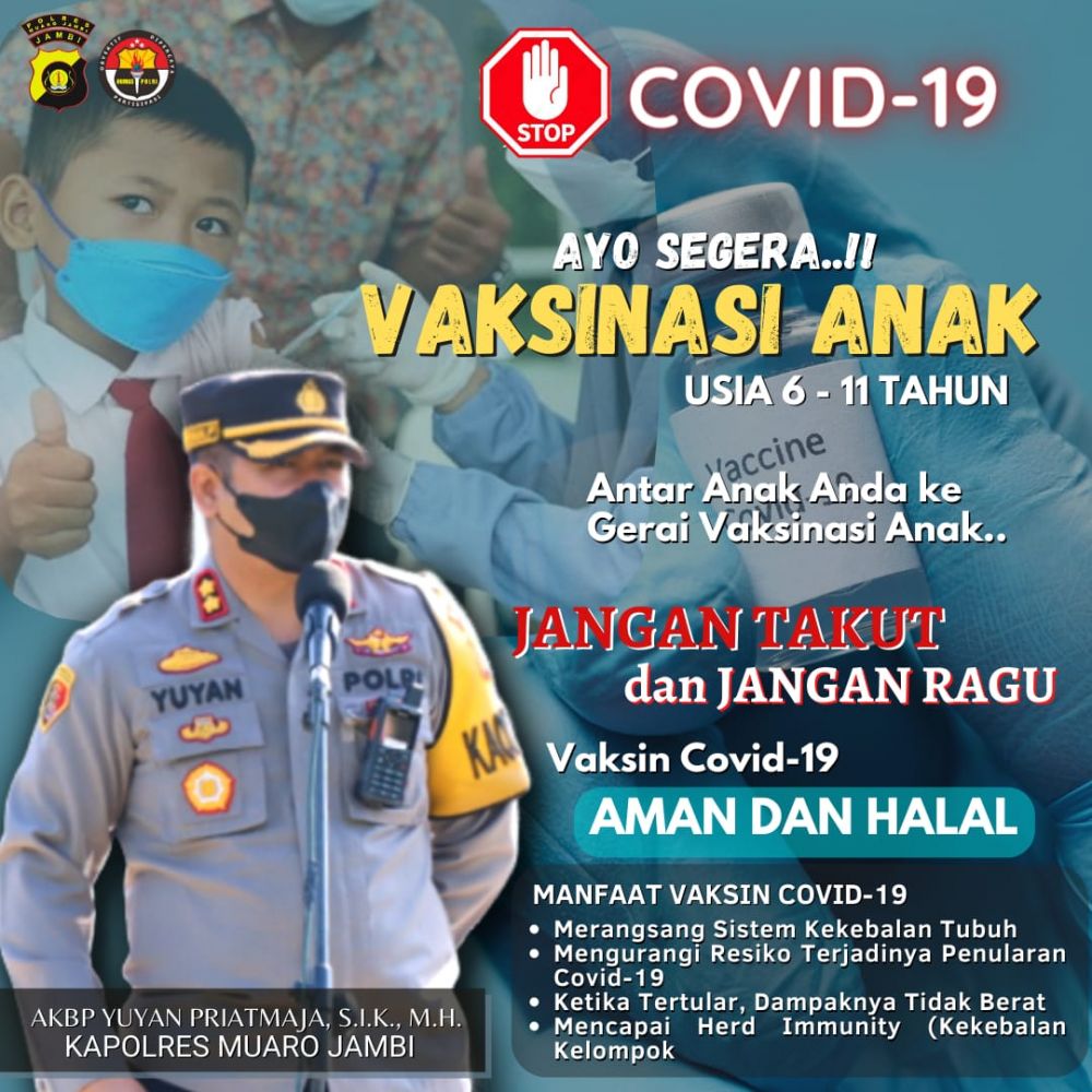 Kapolres Muaro Jambi AKBP .Yuyan Priatmaja .SIK.MH menghimbau kepada orang tua anak usia 6 s/d 11 tahun untuk divaksin karna vaksin halal dan tidak berbahaya ,aman mencegah terlularnya covid 19.