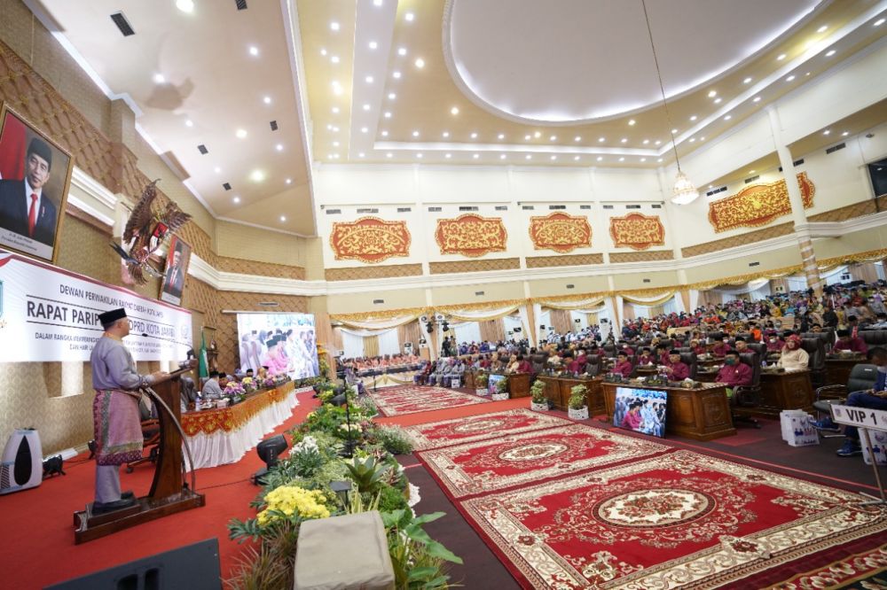 JAMBIPRIMA.COM, JAMBI - DPRD Kota Jambi mengelar Rapat Paripurna dalam rangka memeringati Hari Jadi Tanah Pilih Pusako Batuah ke 621 tahun dan HUT Pemerintah Kota Jambi ke 76. Parupurna yang berlangsung di gedung DPRD Kota Jambi itu dilaksankan pada Sabtu, (28/5).