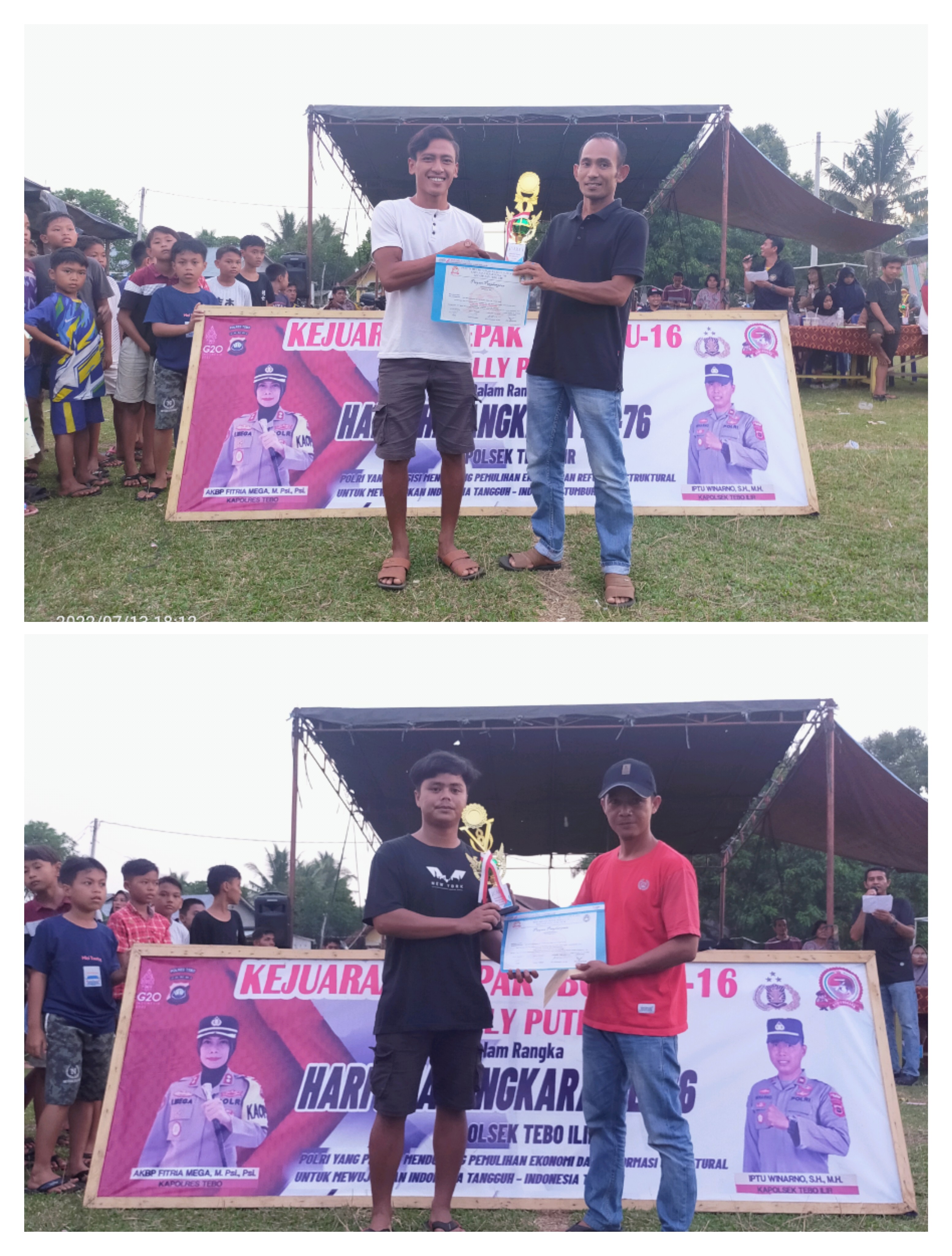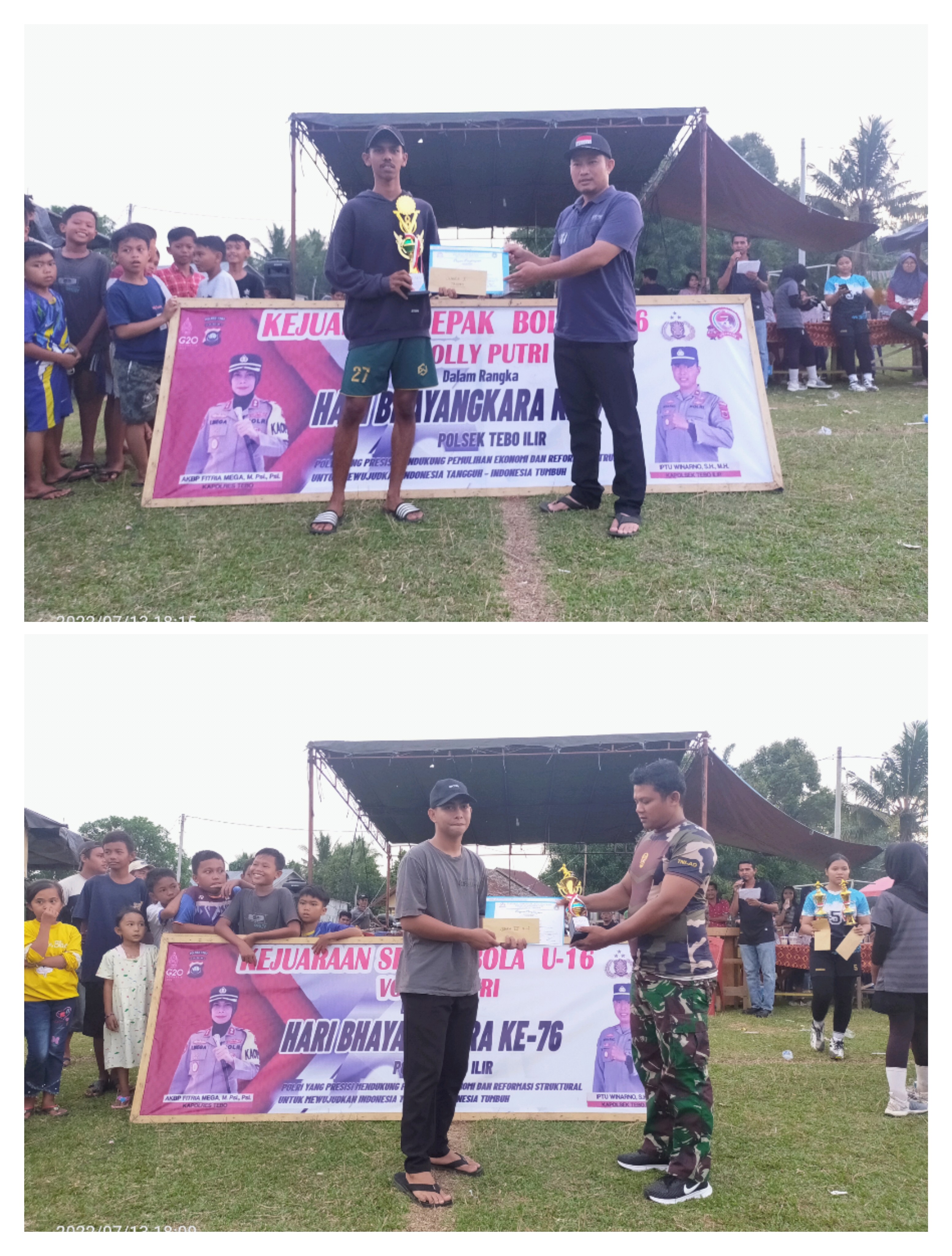 JAMBIPRIMA.COM, TEBO - Turnamen Sepak Bola U 16 dan Volly Ball Putri se - Kecamatan Tebo Ilir dalam rangka HUT Bhayangkara ke 76 Polsek Tebo Ilir yang dilaksanakan di lapangan sepak bola Dusun Lamo, Kelurahan Sungai Bengkal, Kecamatan Tebo Ilir telah berakhir, pada Rabu (13/7/2022).