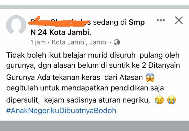 Adapun status tersebut bertuliskan sebagai berikut: “Tidak boleh ikut belajar murid disuruh pulang oleh gurunya, dgn alasan belum di suntik ke 2 Ditanyain Gurunya Ada tekanan keras dari atasan. Begitulah untuk mendapatkan pendidikan saja dipersulit, kejam sadisnya aturan negriku, #AnakNegerikuDibuatnyaBodoh,”