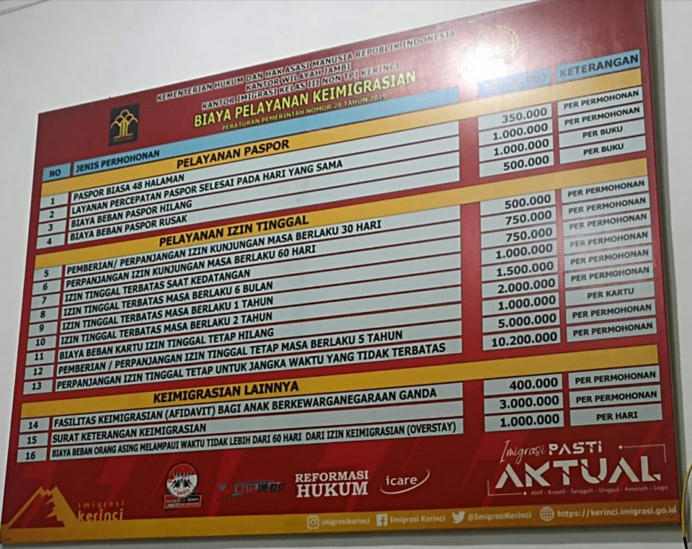 Sedangkan Kasubsi Pelayanan dan Verifikasi Dokumen Keimigrasian, Imigrasi Kelas II Non TPI Kerinci, Albabun Ilham, menambahkan,bahwa, untuk membuat Pasport di Imigrasi Kerinci biayanya sudah ada tarif yang telah ditetapkan.