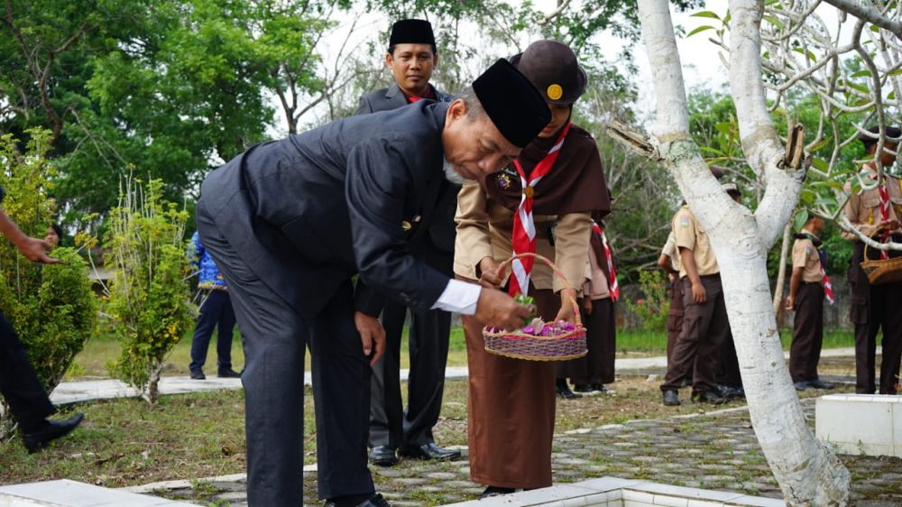 Usai upacara bupati, Wabup Nilwan Yahya dan rombongan melakukan tabur bunga di Taman makam Pahlawan Patriot Bhakti Merangin.(lan)