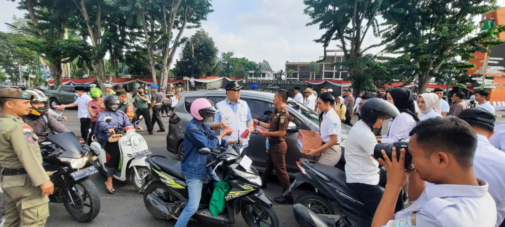 Pada pembagian bendera merah putih ini, turut melibatkan para pelajar di Kota Jambi, Paskibraka, dan bujang gadis Kota Jambi.