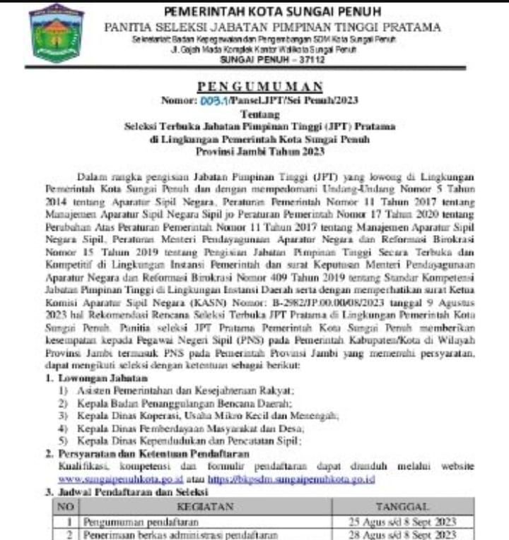 Berdasarkan pengumuman Nomor : 003.1/ lPansel.JPT/Sei Penuh/2023 tentang Seleksi Terbuka Jabatan Pimpinan Tinggi (JPT) Pratama di Lingkungan Pemerintah Kota Sungai Penuh Tahun 2023 yang ditandatangani ketua panitia Prof Dr Haryadi.