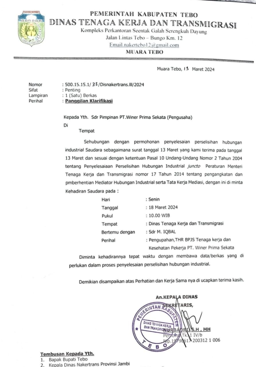 JAMBIPRIMA.COM, TEBO - Menindaklanjuti laporan tertulis karyawan pada Rabu 13 Maret 2024, Dinas Tenaga Kerja dan Transmigrasi Kabupaten Tebo segera memanggil pihak PT Winner Prima Sekata (WPS) pada Senin 18 Maret 2024.