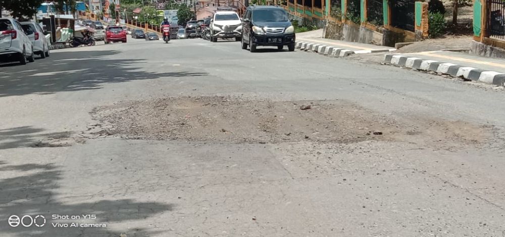 "Lobang cukup dalam, hanya sedikit badan jalan yang bisa dilalui kendaraan kecil, karena jika masuk lobang akan tersangkut karena lobang sangat besar,"jelasnya.