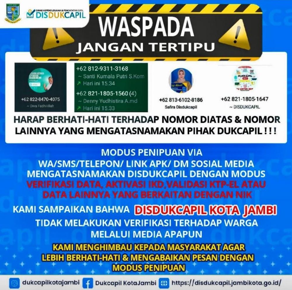 "Kami tegaskan bahwa Disdukcapil Kota Jambi tidak pernah meminta data pribadi melalui WhatsApp, SMS, atau media lainnya. Semua layanan hanya dilakukan melalui jalur resmi," ujarnya, Jumat (10/1/2025).