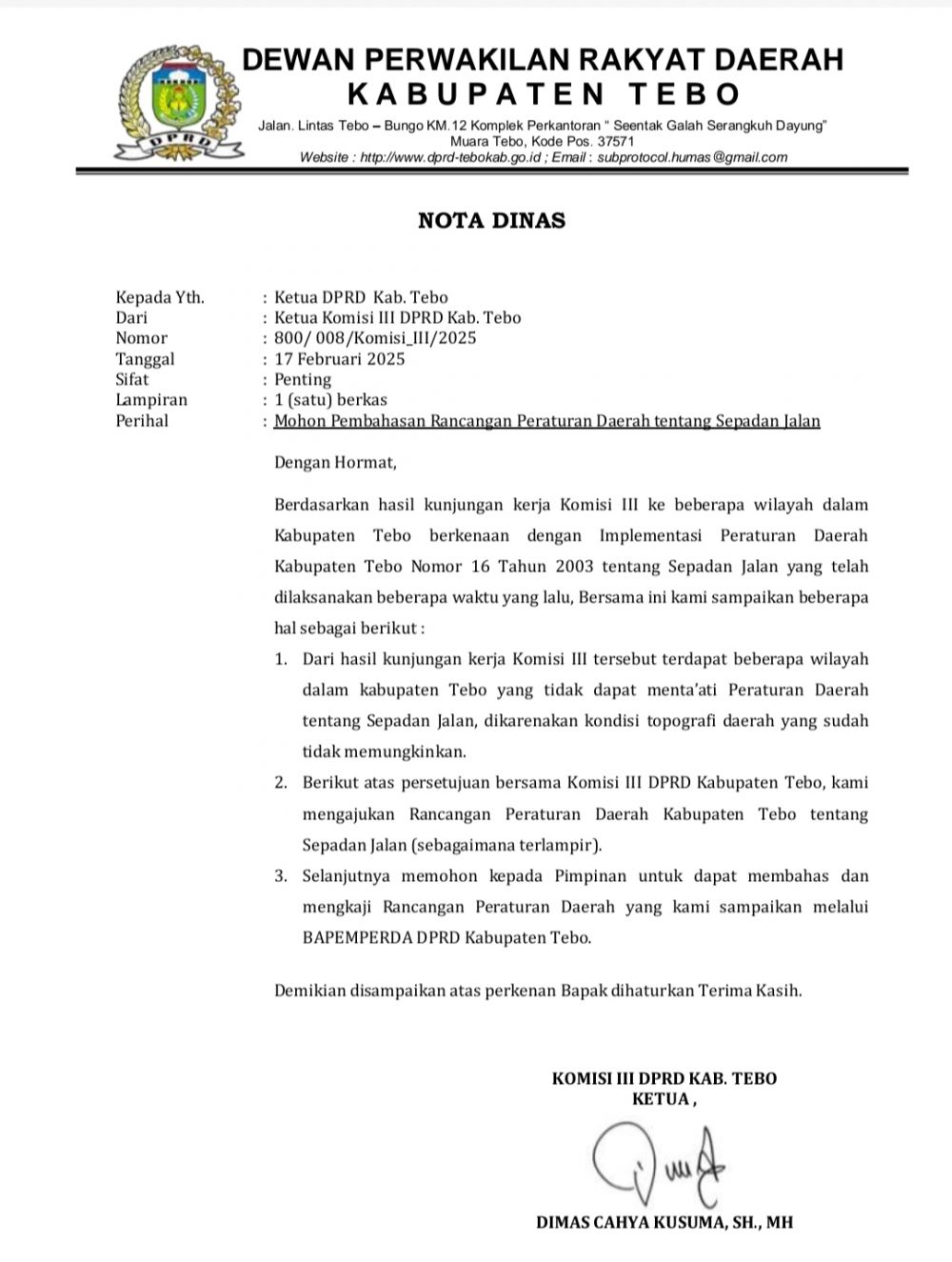 Usulan agar Rancangan Perda Sempadan Jalan tersebut agar dibahas dan dikaji disampaikan melalui nota dinas Nomor: 800/008/Komisi_III/2025 dari Ketua Komisi III kepada Ketua DPRD Tebo.