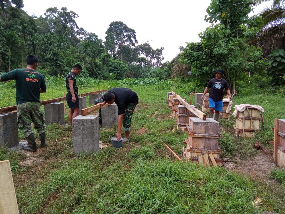 JAMBIPRIMA.COM, TEBO – Anggota Satuan Tugas (Satgas) TNI Manunggal Membangun Desa (TMMD) Ke-123 Kodim 0416/Bute bersama warga Desa Teluk Kuali, Kecamatan Tebo Ulu, Kabupaten Tebo, bahu-membahu memasang gelagar atau tulang lantai kandang kambing, Rabu 26 Februari 2025.