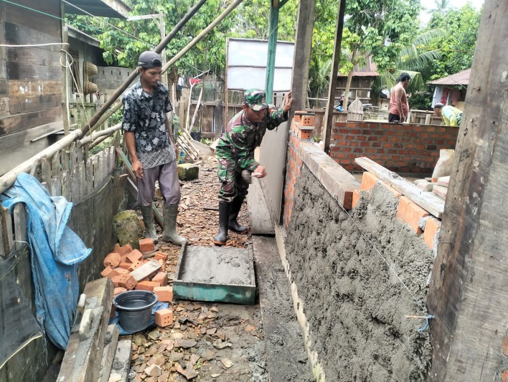 Terlihat dengan semangat para Satgas TMMD mengerjakan plester dinding rumah milik Hendri, penerima manfaat dalam program sasaran fisik TMMD