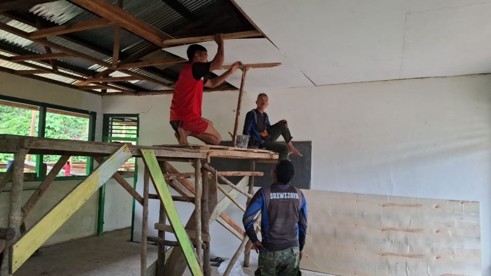 JAMBIPRIMA.COM, TEBO – Anggota Satgas TMMD Ke-123 Kodim 0416/Bute memulai pemasangan plafon di Madrasah Ibtidaiyah Nurul Falah, Desa Teluk Kuali, Kecamatan Tebo Ulu, Kabupaten Tebo, Jumat 28 Februari 2025.