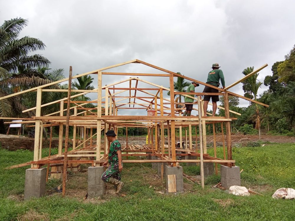 Para petugas terus bekerja keras menyelesaikan pekerjaan fisik dan non-fisik. Salah satu pencapaian terbaru adalah berdirinya sejumlah rangka bangunan kandang kambing sebagai bagian dari program ketahanan pangan terpadu.