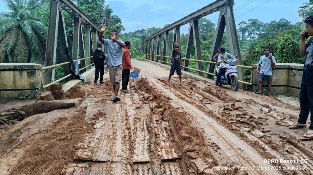 Namun diduga akibat tingginya mobilitas lalu lalang kendaraan tersebut, jembatan Sungai Bungo, Desa Teluk Kayu Putih Kecamatan VII Koto Kabupaten Tebo Provinsi Jambi sekitar pukul 11.00 Wib tadi pada Rabu 5 Maret 2025 putus dan ambles hanya bisa di lalui kendaraan roda dua. (ARD)