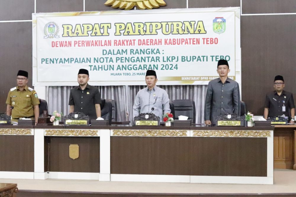 JAMBIPRIMA.COM,TEBO - Ketua dewan perwakilan rakyat daerah (DPRD) Kabupaten Tebo Khalis Mustiko, didampingi Wakil ketua (Waka) I DPRD Tebo, Ihsanudin, Waka II DPRD Tebo, Sahendra pimpin rapat paripurna (Rapurna) penyampaian nota pengantar laporan keterangan pertanggung jawaban (LKPJ) Bupati Tebo tahun anggaran 2024.