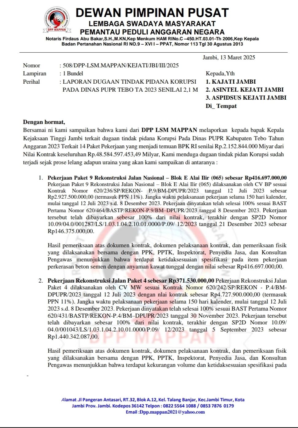 Nomor : 508/DPP-LSM.MAPPAN/KEJATI/JMB/III/2024 Perihal Laporan Tipikor pada Dinas PUPR Kabupaten Tebo senilai 2,1 Milyar atas 14 Paket proyek tahun 2023.