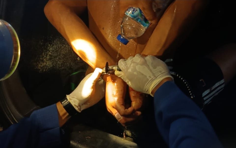 Dipimpin oleh Danton II Bambang Sugiono, lima personel Damkartan Kota Jambi diterjunkan ke lokasi. Dengan menggunakan gerinda mini, tang potong, dan penjepit khusus, tim bekerja ekstra hati-hati di tengah upaya perlawanan pasien yang cukup kuat.
