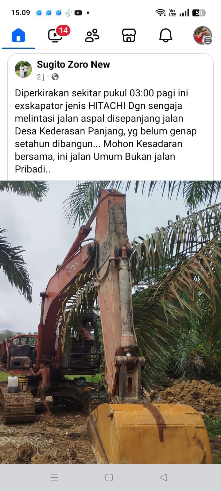 "Diperkirakan sekitar pukul 03:00 pagi ini exskapator jenis HITACHI dengan sengaja melintasi jalan aspal disepanjang jalan Desa Kederasan Panjang, yang belum genap setahun dibangun, Mohon Kesadaran bersama, ini jalan Umum Bukan jalan Pribadi, " cuit warga Batang Masumai Desa Kederesan Panjang Sugito Zoro.