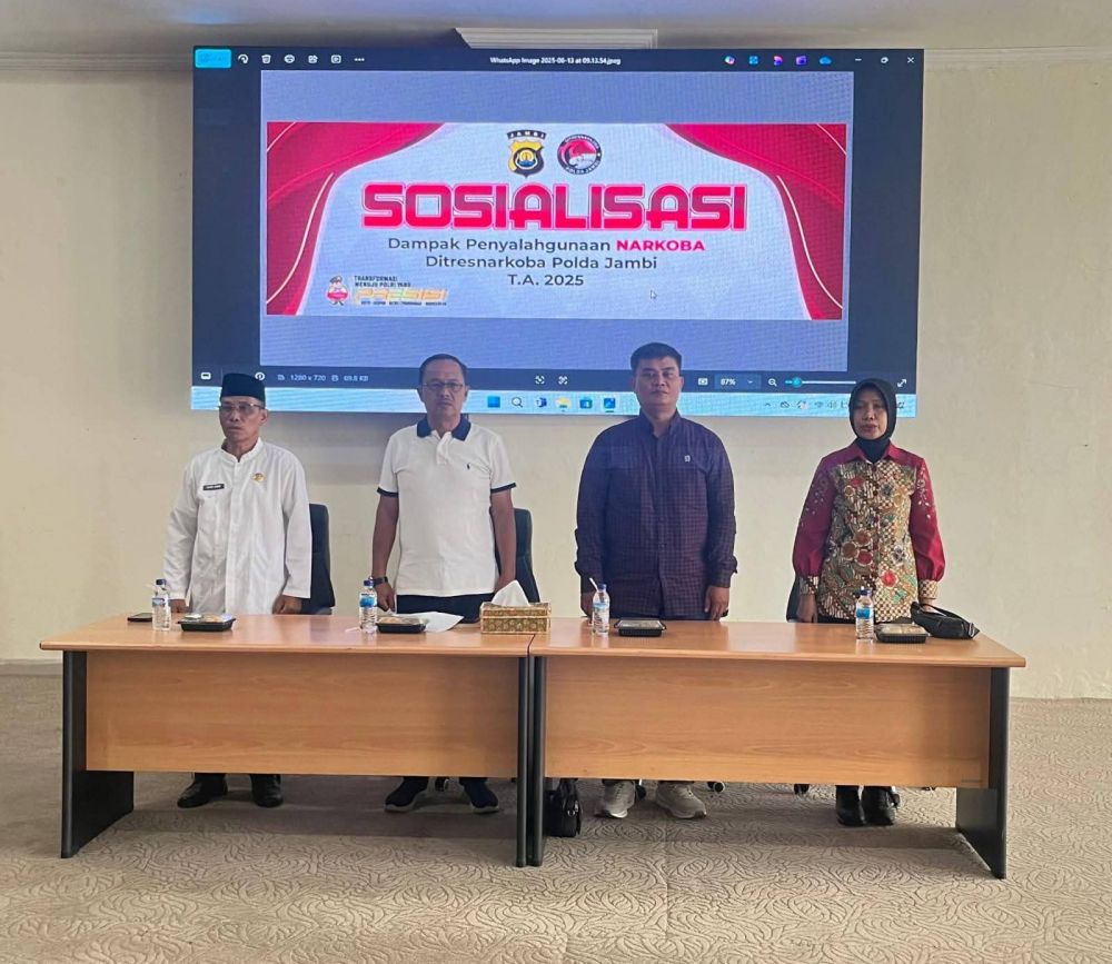 JAMBIPRIMA.COM, KERINCI - Pemerintah Daerah Kabupaten Kerinci bekerja sama dengan Direktorat Reserse Narkoba (Ditresnarkoba) Polda Jambi menggelar kegiatan sosialisasi mengenai dampak penyalahgunaan narkoba. Acara ini diselenggarakan di Ruang Pola Kantor Bupati Kerinci yang berlokasi di Bukit Tengah, Jum’at (13/6/2025).