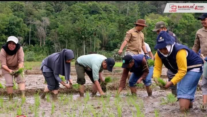JAMBIPRIMA.COM, KERINCI - Dalam rangka mendukung program swasembada pangan nasional, Bupati Kerinci Monadi, S.Sos, M.Si turun langsung ke sawah untuk melakukan penanaman padi secara serentak bersama masyarakat Desa Talang Kemulun, Selasa, (24/6/2025) pagi.