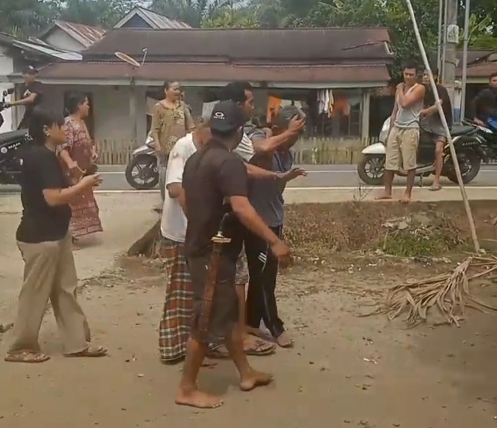 Tidak hanya sampai disitu, meski telah di lerai oleh pria berbaju putih, namun pria berbadan kekar tersebut tampak semakin beringas dengan mencabut sebilah senjata tajam dari pinggangnya dan kemudian mengacungkan kearah pria paruh Bayah tersebut.