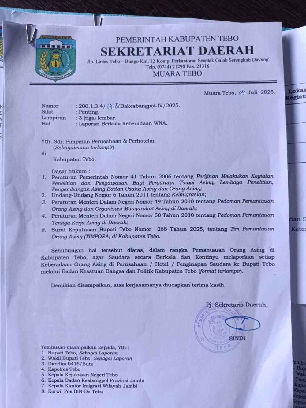 Tim pemantauan orang asing(Timpora) telah bersurat dan mengimbau kepada pimpinan perusahaan, pengusaha hotel dan Ponpes yang ada di Kab Tebo apabila ada pergerakan keberadaan orang asing bisa cepat terdeteksi,"ujar kepala badan (Kaban) Kesbangpol Kab Tebo, Sugiyarto, Kamis 7 Agustus 2025.