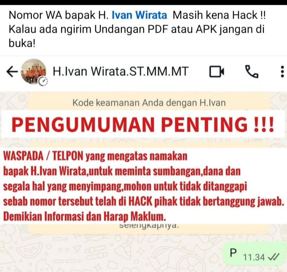 Tidak hanya itu, pelaku juga menggunakan modus lain dengan mengirimkan tautan dan file undangan dalam bentuk PDF. File tersebut diduga berisi aplikasi berbahaya yang bisa mengambil alih akun WhatsApp korban. Karena itu, masyarakat diingatkan jangan pernah mengklik atau membuka file maupun tautan mencurigakan yang dikirimkan melalui pesan WhatsApp.