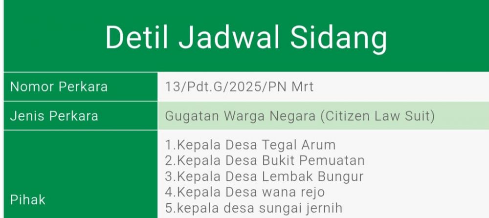 Sementara itu berdasarkan sistem informasi penelusuran perkara PN Tebo, 5 orang Kades dalam gugatan citizen law suit tersebut antara lain Desa Tegal Arum, Bukit Pemuatan, Lembak Bungur, Wanarejo, dan Sungai Jernih.(ARD)