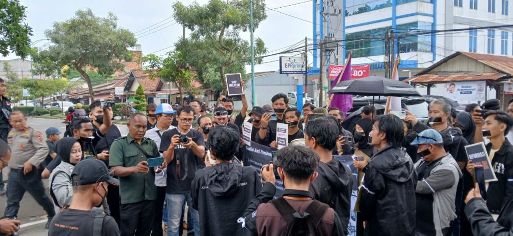 “Pakaian serba hitam dan mulut yang ditutup lakban ini adalah simbol matinya demokrasi ketika pers dibungkam. Ini bentuk protes kami,” tegas Hidayat, wartawan Metro Jambi yang menjadi koordinator lapangan aksi.