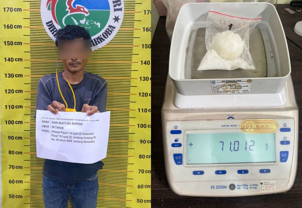 “Petugas kemudian mengamankan pelaku dan melakukan penggeledahan. Dari hasil penggeledahan ditemukan satu paket narkotika jenis sabu dengan berat bruto 71,012 gram,” kata Kasi Humas Polres Merangin Iptu Sakirman, Jumat (19/12/25).