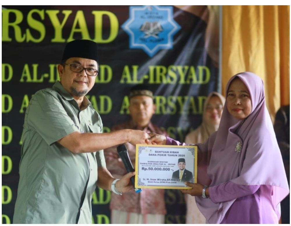 JAMBIPRIMA.COM, MUARO JAMBI – Wakil Ketua I DPRD Provinsi Jambi, Ivan Wirata, kembali menegaskan komitmennya dalam mendukung pembangunan sumber daya manusia yang berimbang antara penguasaan ilmu pengetahuan umum dan ilmu agama. Komitmen tersebut diwujudkan melalui penyaluran Bantuan Hibah Dana Pokok Pikiran (Pokir) Tahun Anggaran 2025 sebesar Rp50 juta untuk Madrasah Diniyah Takmiliyah Awaliyah (MDTA) Al-Irsyad, yang berlokasi di Kelurahan Pijoan, Kecamatan Jambi Luar Kota, Kabupaten Muaro Jambi.