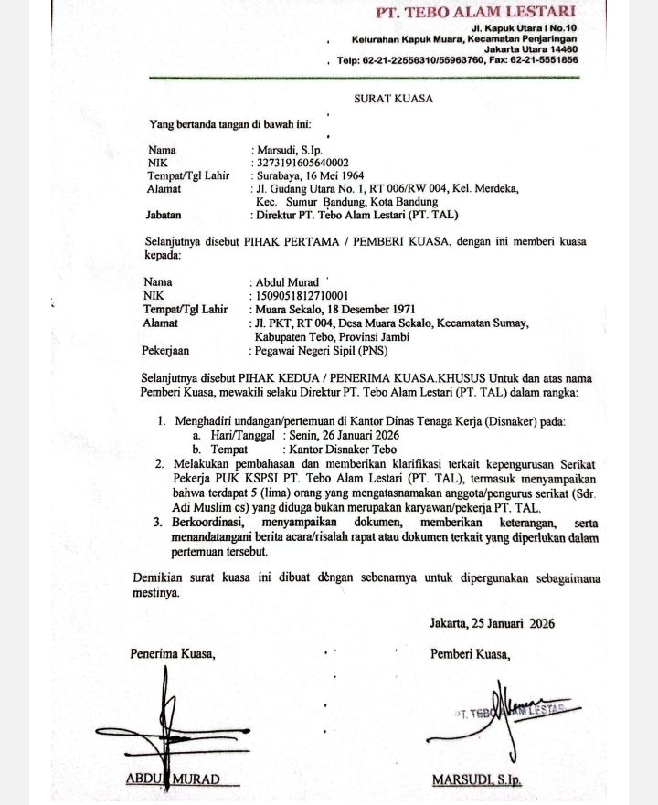 JAMBIPRIMA.COM, TEBO – Pelaksana tugas (Plt) Camat Sumay, Samsuar, mengambil langkah tegas terhadap oknum aparatur sipil negara (ASN) di lingkungan Kantor Kecamatan Sumay, Kabupaten Tebo, Provinsi Jambi, yang terlibat dalam sengketa ketenagakerjaan antara PT Tebo Alam Lestari (PT TAL) dengan karyawan serta serikat pekerja.