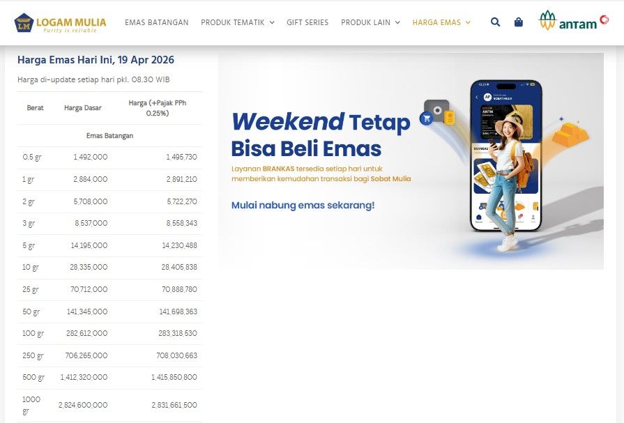 JAMBIPRIMA.COM, JAMBI - Harga emas batangan produksi PT Aneka Tambang Tbk atau Antam tercatat berada di level tinggi pada Minggu (19/4/2026). Berdasarkan data resmi Logam Mulia yang diperbarui pukul 08.30 WIB, harga emas 1 gram mencapai Rp2.891.210 setelah dikenakan pajak.