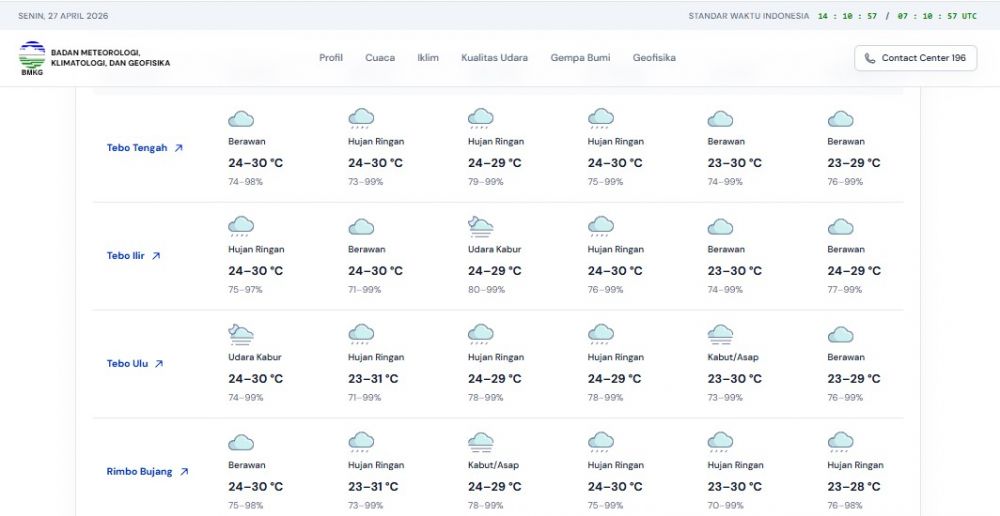 Pada Minggu (26/4), sejumlah wilayah seperti Tebo Ulu, Rimbo Bujang, dan Serai Serumpun berpotensi mengalami hujan ringan, sementara wilayah lain cenderung berawan. Memasuki Senin (27/4) hingga Selasa (28/4), kondisi berawan masih mendominasi hampir seluruh kecamatan.