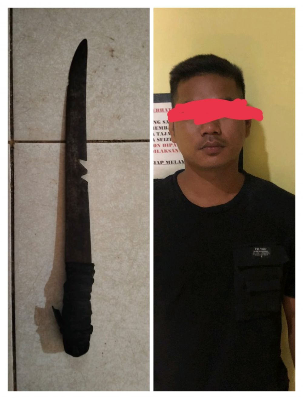 Saat dilakukan penggeledahan di badan tersangka petugas menemukan sebilah senjata tajam dengan panjang 36 cm yang diselipkan di pinggang dibalut dengan kain.