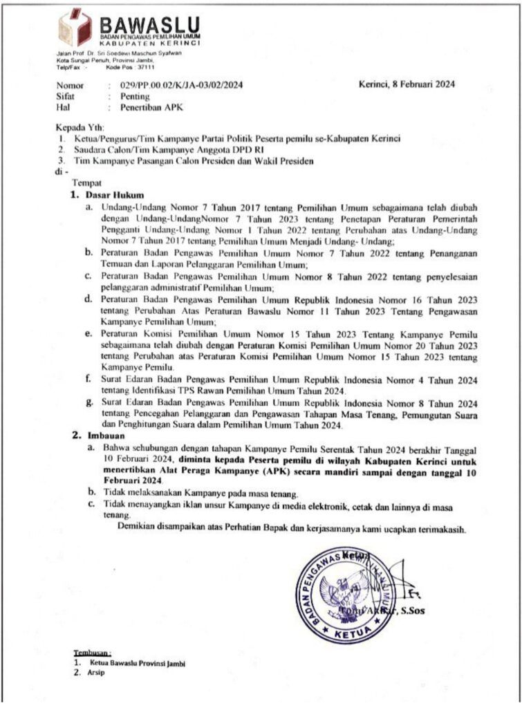 Pihak Bawaslu Kerinci juga telah mengeluarkan himbauan kepada peserta pemilu untuk menurunkan Alat Peraga Kampanye (APK) sampai tanggal 10 Februari 2023, secara mandiri karena besok (Minggu,red) telah masuk masa tenang.