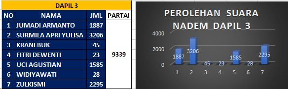 Berikut urutan kursi yang diraih parpol dari dapil 3. Kursi pertama ditempati oleh dr. Surmila Apri Yulisa dari Nasdem, yang meraih 3.206 suara caleg. Nasdem sendiri memperoleh 9.339 suara partai, atau 24,8 persen dari total suara sah di dapil III yang berjumlah 37.591 suara.