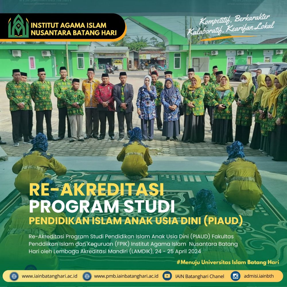 Dr. Ansori, S.Pd.I., M.Pd.I, Rektor IAI Nusantara Batang Hari menjelaskan bahwa Re-Akreditasi Program Studi Pendidikan Islam Anak Usia Dini (PIAUD) Fakultas Pendidikan Islam dan Keguruan (FPIK) merupakan bentuk komitmen IAI Nusantara Batang Hari dalam meningkatkan mutu Tri Dharma Perguruan Tinggi.