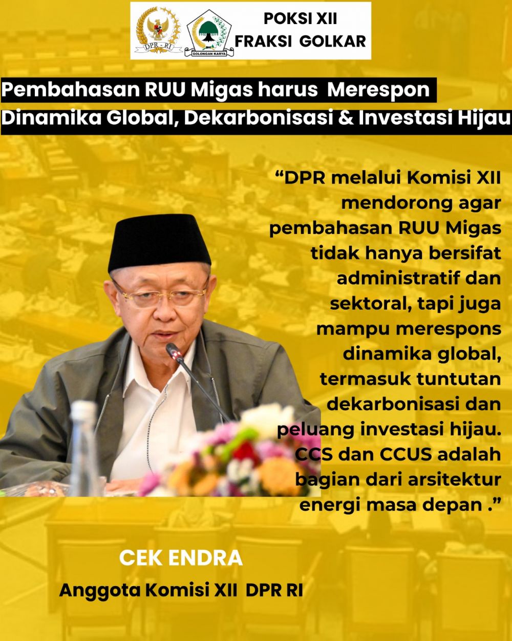 Anggota Komisi XII DPR RI dari Fraksi Partai Golkar, Cek Endra, menyatakan bahwa dukungan terhadap CCS/CCUS harus diperkuat dengan payung hukum yang memadai dan insentif yang tepat.