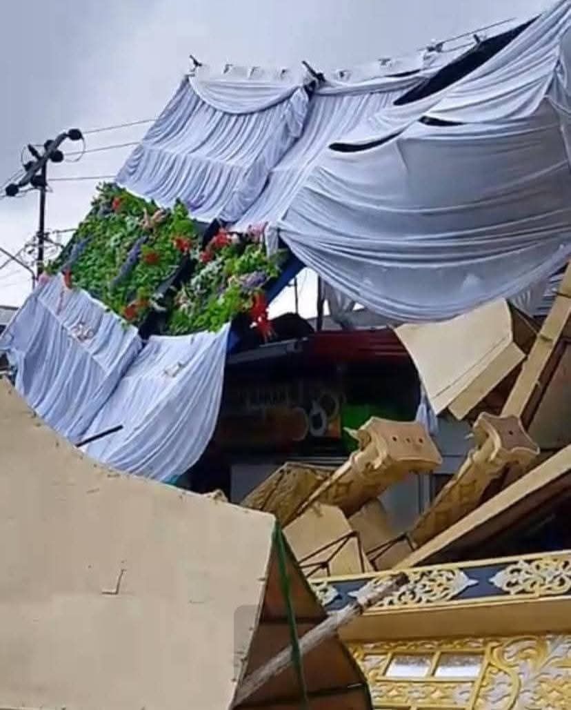 Bahkan para pedagang di buat panik, karena atap dan barang dagangan pedangan banyak berterbangan. Tenda pelaminan yang sudah di pasang juga ikut berterbangan.