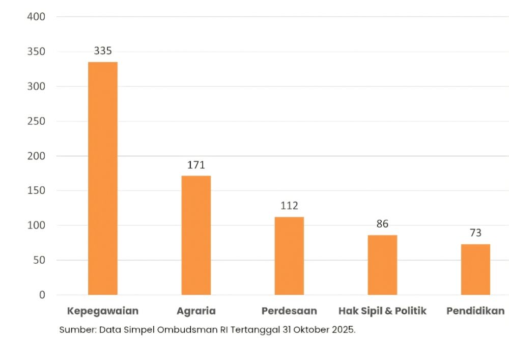 Dari total laporan yang masuk dalam kurun waktu lima tahun itu, terdapat lima substansi laporan terbanyak yang mendominasi pengaduan ke Ombudsman Jambi. Sektor kepegawaian menjadi substansi dengan jumlah laporan tertinggi, yakni 335 laporan. Selanjutnya disusul sektor agraria sebanyak 171 laporan, perdesaan sebanyak 112 laporan, hak sipil dan politik sebanyak 86 laporan, serta pendidikan sebanyak 73 laporan.